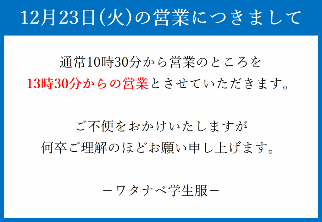 12月23日(火)の営業につきまして、13時30分からの営業となります。